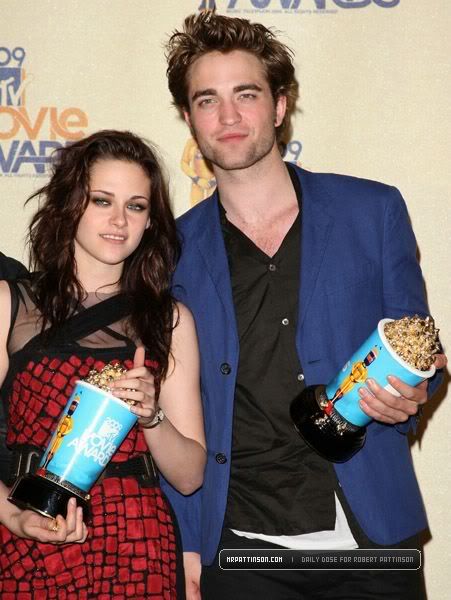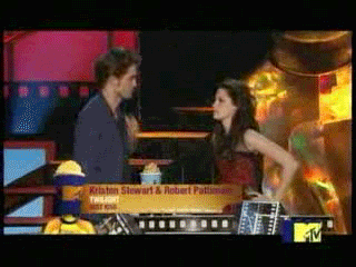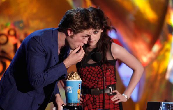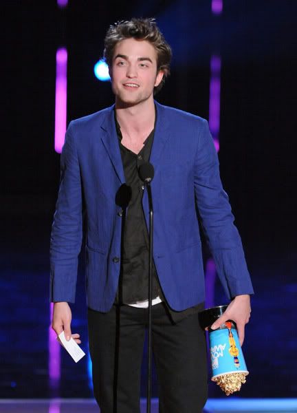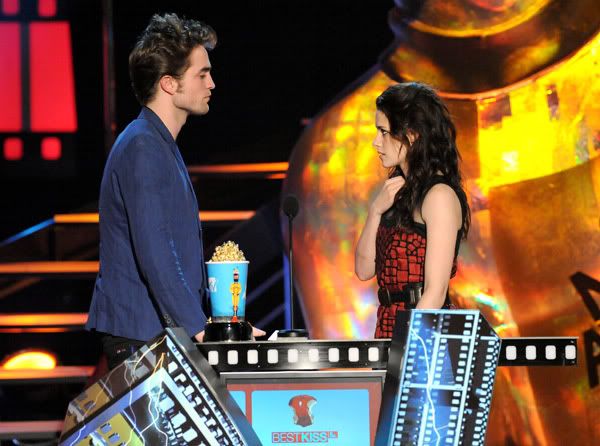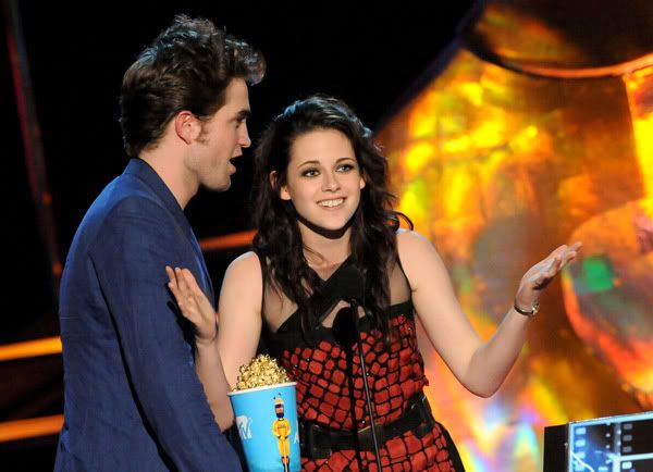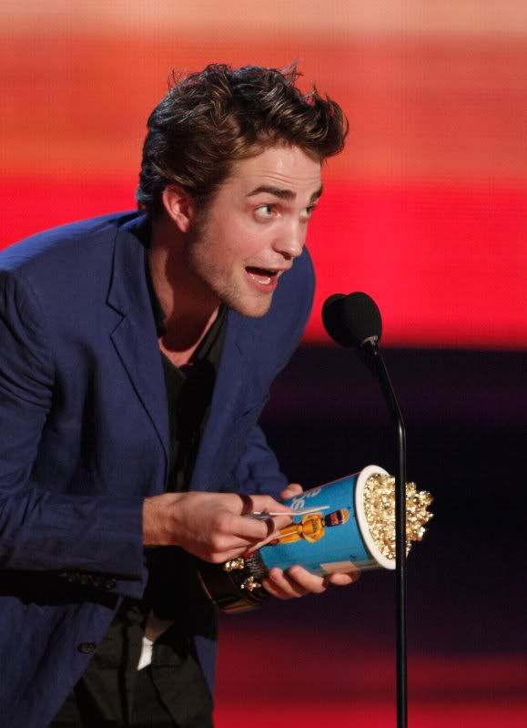 9:52: Moments after winning “Best Fight,” Robert Pattinson came backstage, gave thumbs-up to the cameras - and made a beeline right for us. Smiling and running his fingers through his hair (of course), he told us he was excited for Cam to have won “Best Fight” two years in a row. Even Rob hasn’t seen the “New Moon” trailer yet, so he was eager to watch it with the fans tonight. RPattz said he’s loving the Movie Awards, and that he’s eager to begin production Monday on an untitled drama that he’ll squeeze in between “Twilight” sequels.